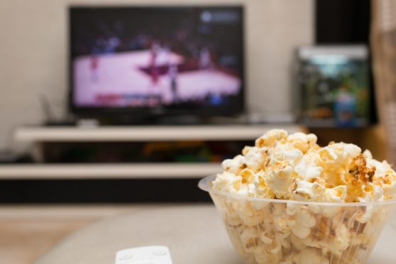 popcorn and remote control on sofa with a TV broadcasting basketball match on background